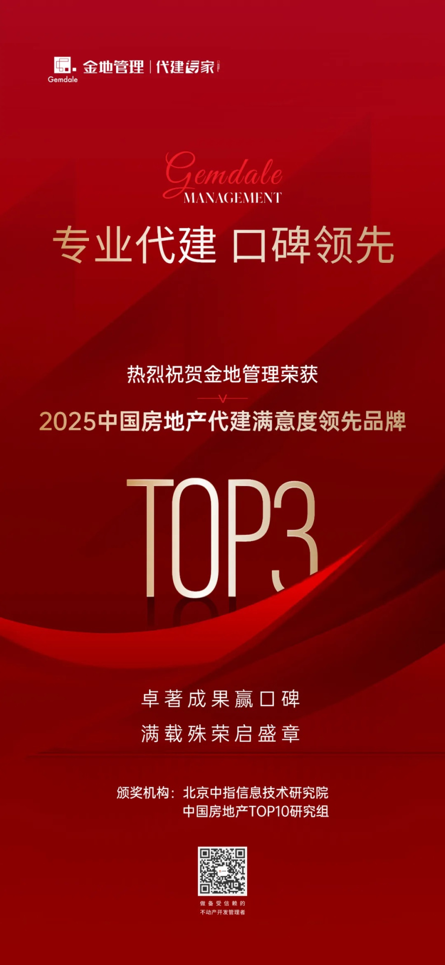 金地管理将专业能力转化为可量化价值,以显性化的价值创造回报委托方信赖,品牌口碑持续提升。此次金地管理荣获“2025中国房地产代建满意度领先品牌”TOP3奖项,充分彰显了委托方对金地管理专业用心服务的高度评价。